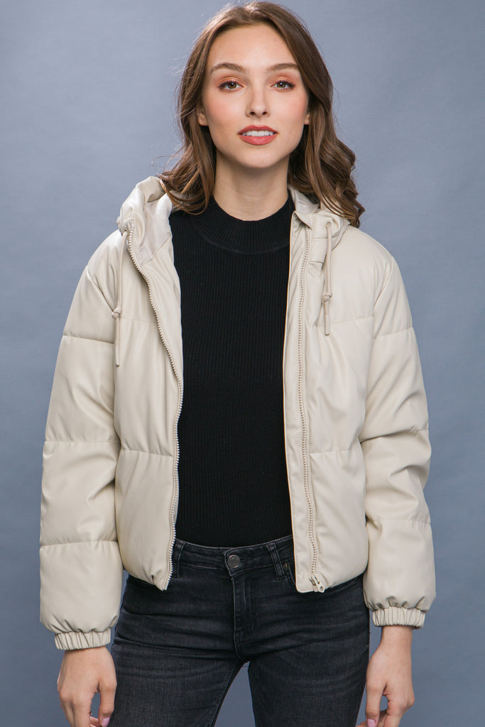 Pu Faux Leather Zipper Hooded Puffer Jacket
