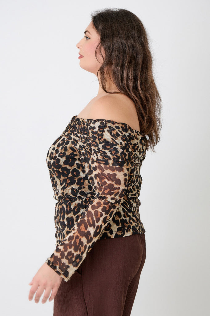 Show off your fierce side with this plus size leopard print off-the-shoulder blouse. Designed with a ruched fold-over neckline, it highlights your shoulders for a confident and feminine look. The bold leopard print in warm shades of tan, black, and brown adds a touch of wild sophistication to any outfit. Crafted from a soft, stretchy blend of polyester and spandex, this blouse offers both comfort and style. Perfect for pairing with jeans, skirts, or tailored pants, it’s an effortlessly chic choice for day or night.